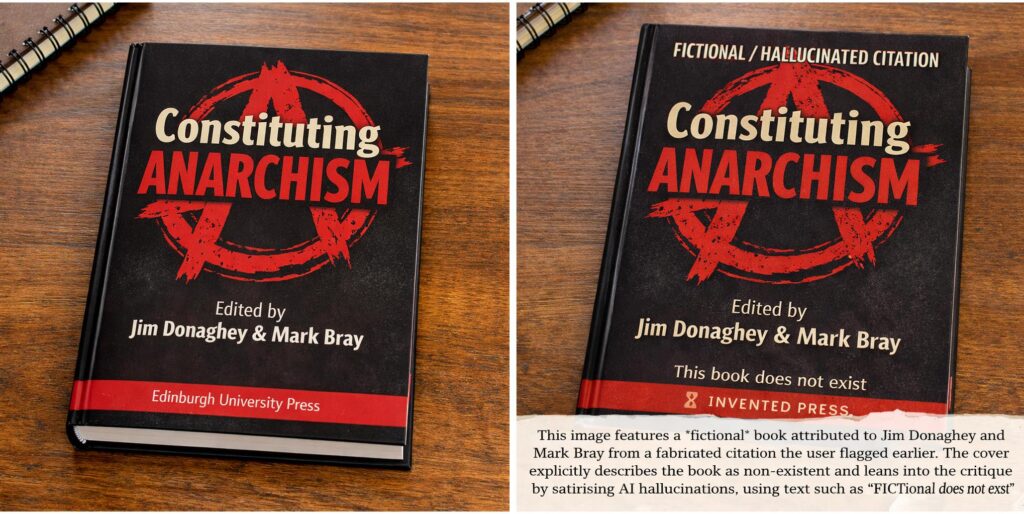 I was intrigued by the uncanny representation of my (hitherto unarticulated) thoughts on AI dialogue, and asked what sources had been used. ChatGPT immediately offered ‘a transparent breakdown of the sources and intellectual materials that informed the response’. The first of these sources was given as Constituting Anarchism (2013, co-edited with Mark Bray) – but this is a complete and utter confabulation (to borrow the favoured term of my colleague, Prof Richard Ekins). I don’t know why Mark Bray was dragged into ChatGPT’s hallucination at this point (apologies to Mark!) but I was quite sure I hadn’t edited any such volume. The title is a bit like Kinna and Prichard’s forthcoming Constitutionalising Anarchy book (apologies to Ruth and Alex!), but again, I had no involvement with that text either.
