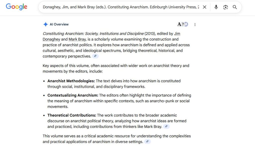 At this point, I had to check whether the book Constituting Anarchism might actually have been edited by Mark Bray, and the confabulation was simply the addition of my name to an existing piece of work. So I asked Google, whose search function promotes its own AI chatbot at the top of the results page. This is a totally separate AI (Gemini), but its response continued the hallucination and even added to it: