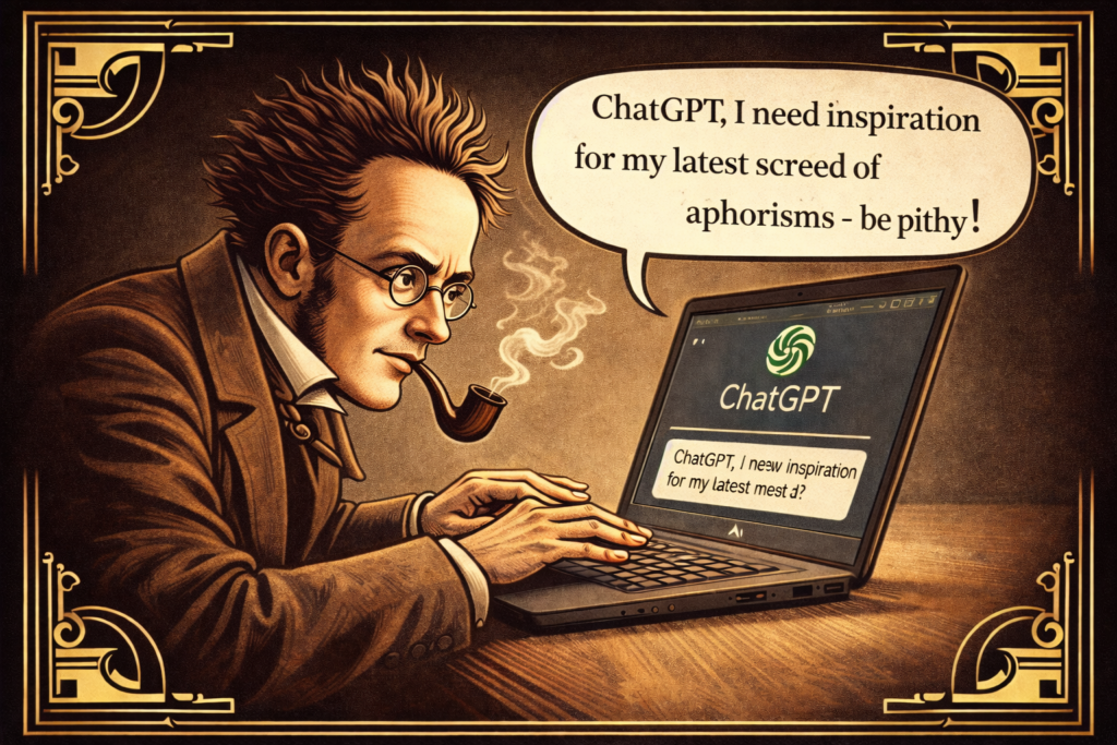 [ChatGPT image. Prompt: Generate an image of Max Stirner hunched over a laptop, interacting with ChatGPT. Add some art-deco flourishes. Stirner should be requesting inspiration for his latest screed of aphorisms. He should be smoking a pipe.]